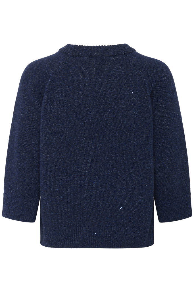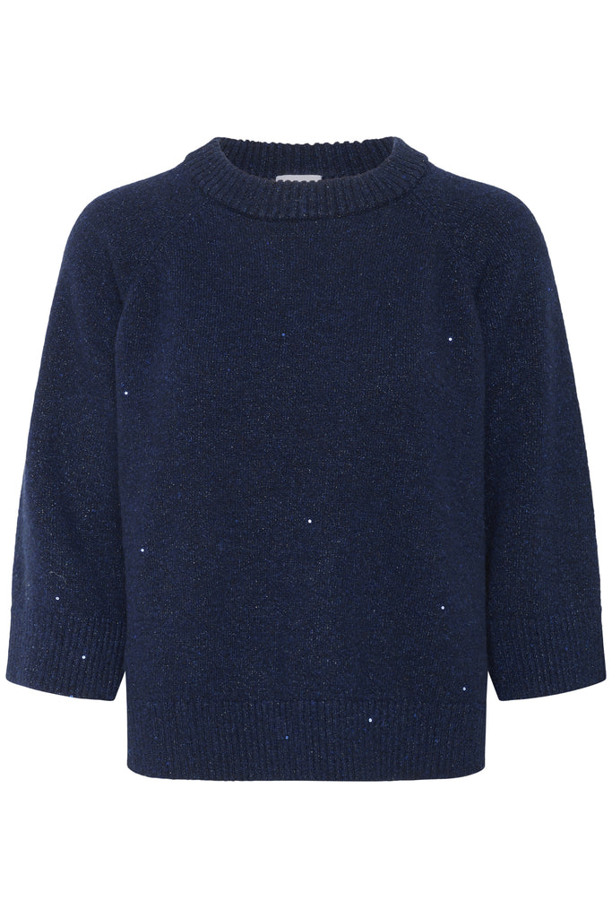 The Nova Pullover combines classic navy knitwear with subtle glitter thread accents, adding a refined shimmer to a timeless design. Its 3/4 sleeves offer a flattering fit and versatile style, perfect for elevating both casual and elegant looks with understated sophistication.