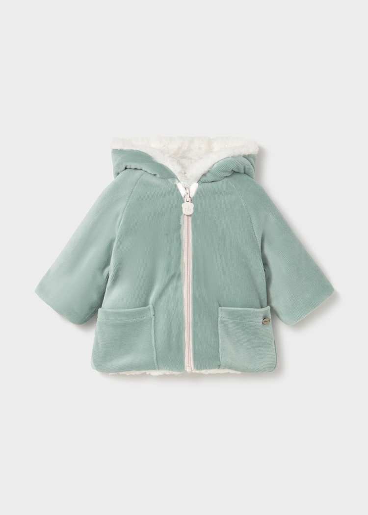 Raglan sleeve newborn coat. Hood with faux fur detailing. Front, central zip fastening. Soft polyester inner lining. Functional front pockets. The item has a unisex design which offers great versatility through its neutral colour tones and shape. This is a reversible item.