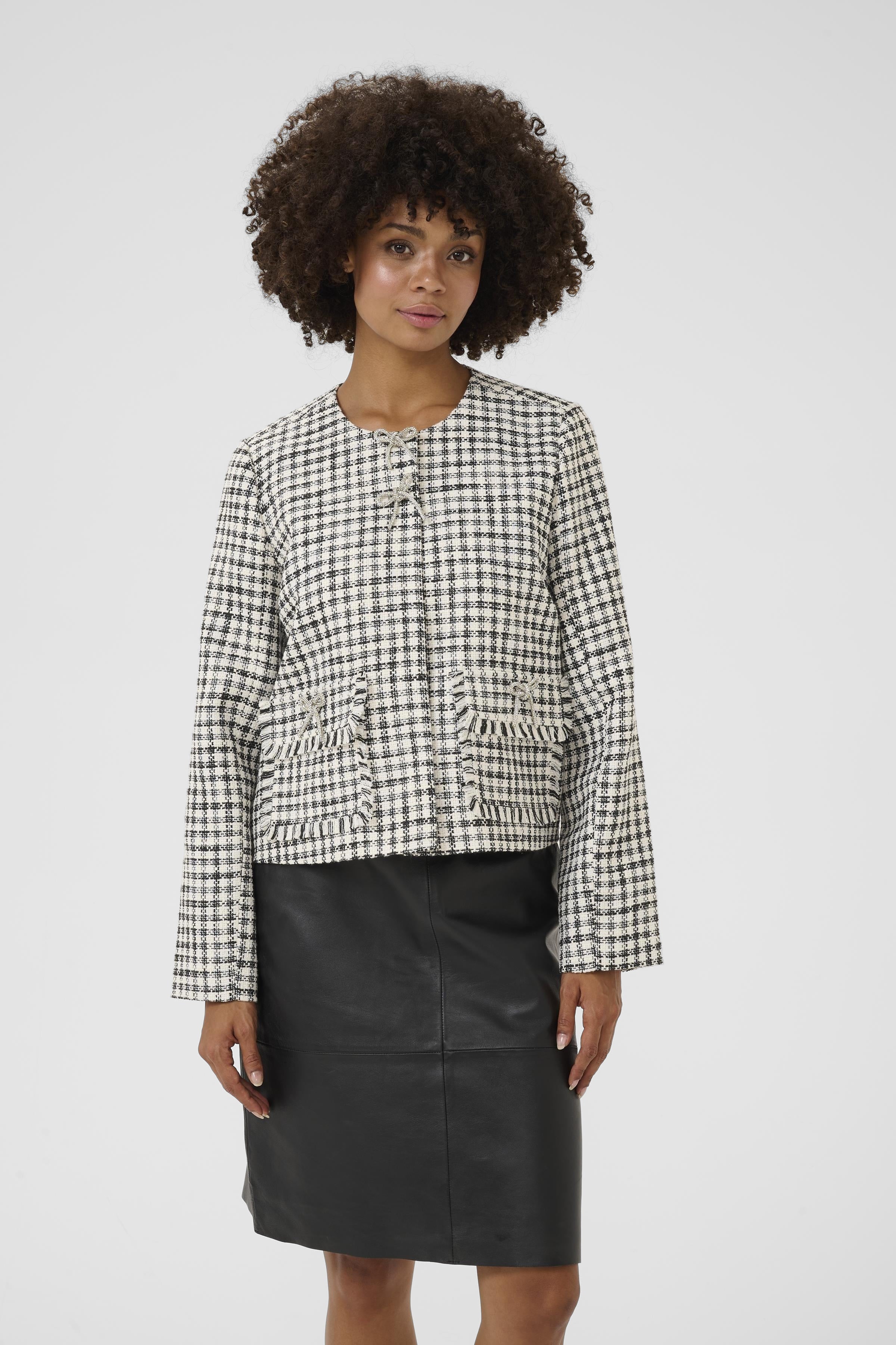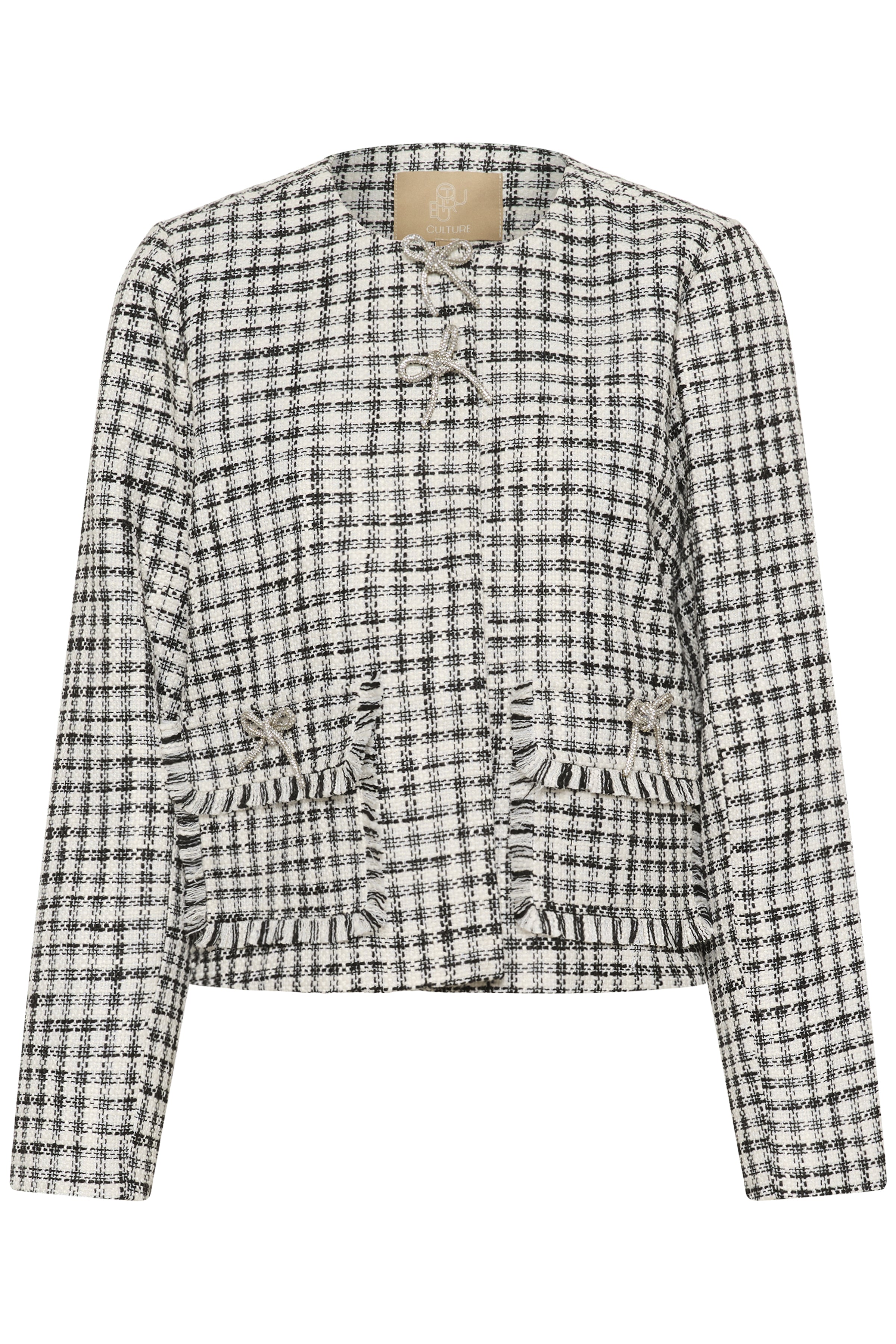 The Heaven Jacket combines timeless elegance with subtle sparkle, featuring a classic houndstooth-inspired print that adds refined texture. Finished with eye-catching diamante bow button details, it offers a touch of delicate charm while maintaining a sophisticated look. Perfect for elevating your everyday wardrobe, this jacket provides both style and confidence for any occasion.