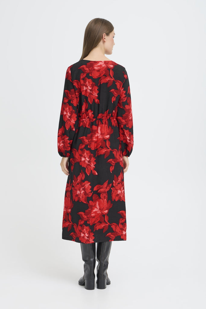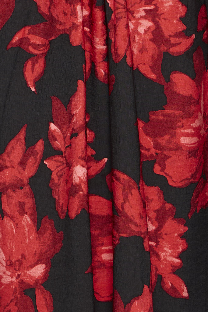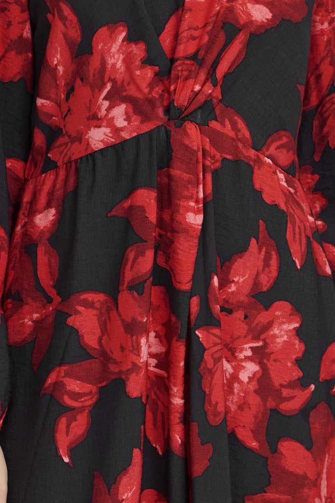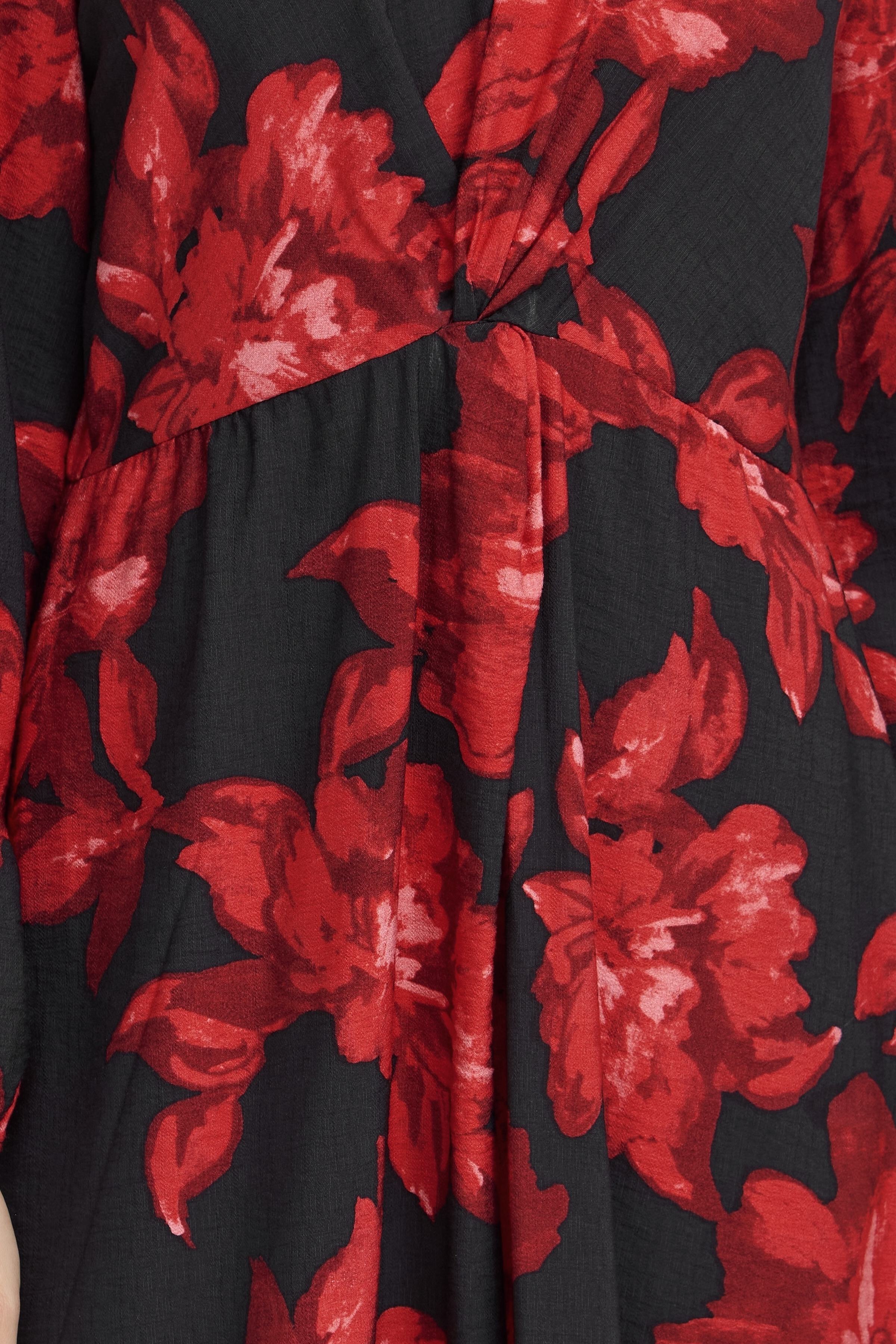 This Lysine Dress features a classic black base adorned with a striking red floral pattern, creating a timeless and elegant look. Its midi length offers a flattering fit suitable for various occasions, from casual outings to special events. Designed to complement your natural style, this dress combines comfort and sophistication effortlessly.