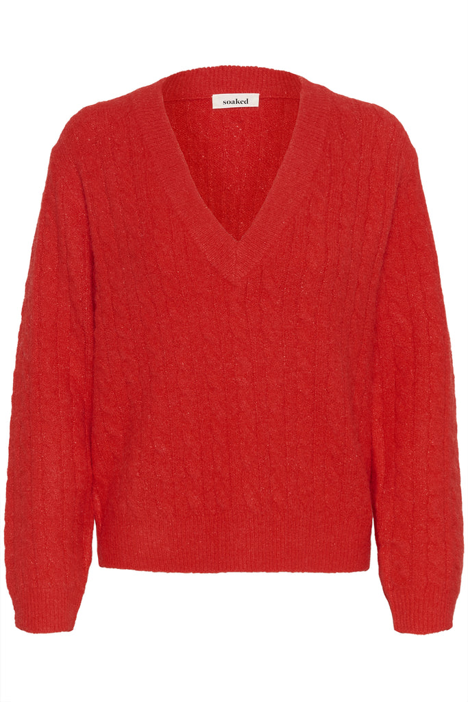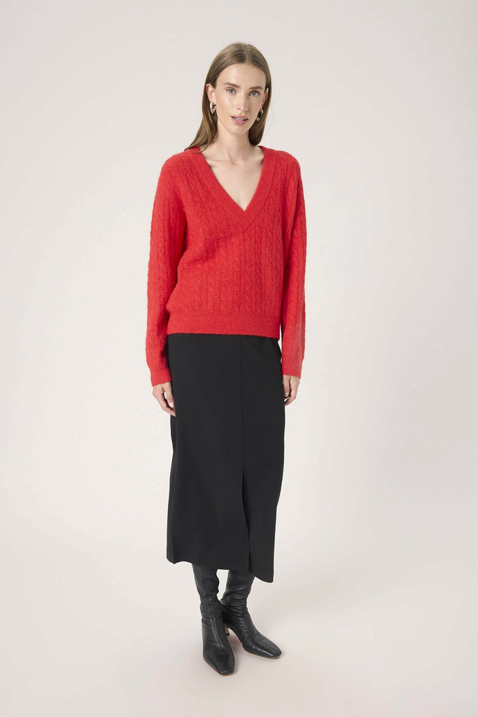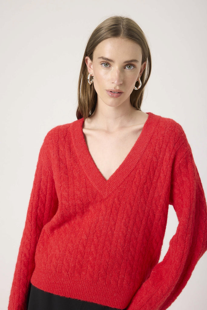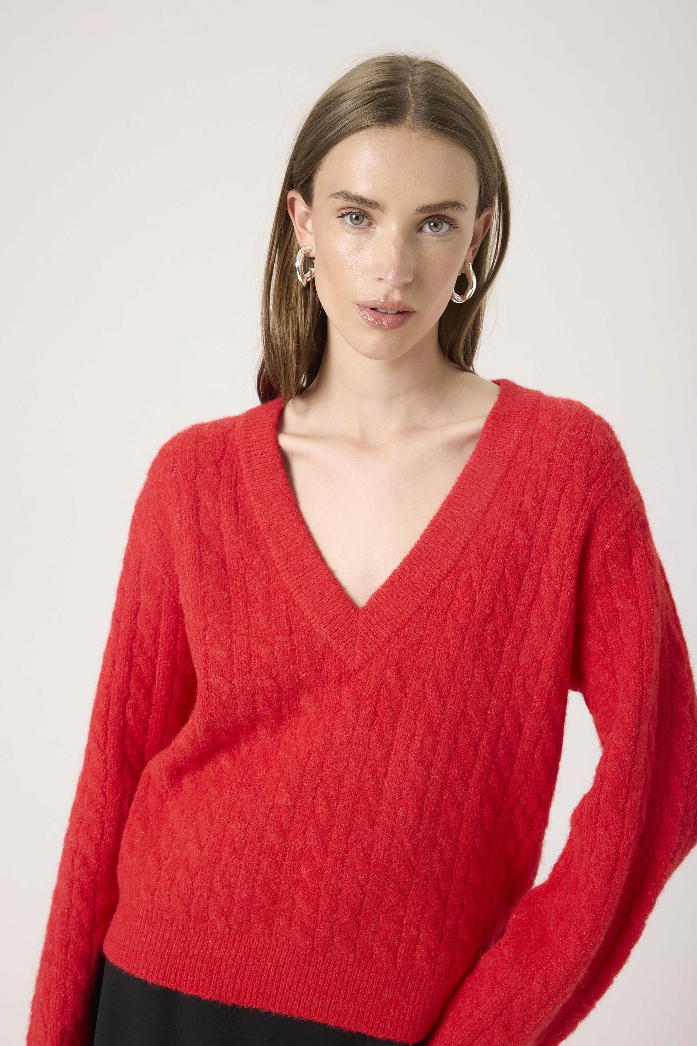 The Vespera Pullover is a beautifully knitted v-neck sweater in a vibrant red shade. Its soft texture provides comfortable warmth, making it perfect for layering on cooler days. Designed to offer both style and coziness, this pullover adds a cheerful pop of colour to your wardrobe while keeping you comfortably wrapped throughout the season.