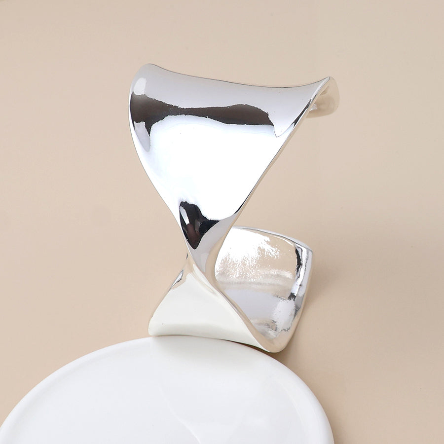 Silver plated wide cuff style bangle with a twisted front and open back.