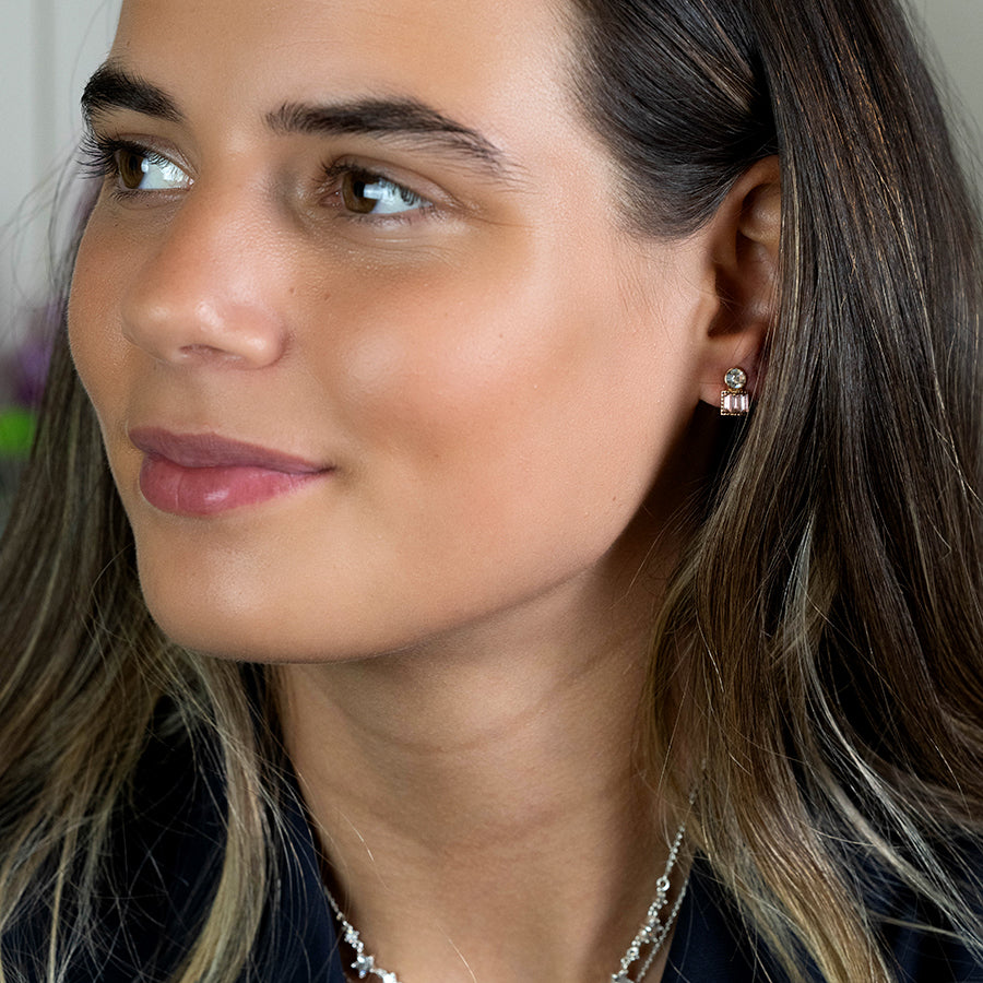 Faux gold plated round clear crystal stud earrings with triple oblong dusky pink crystals beneath in a decorative setting.
