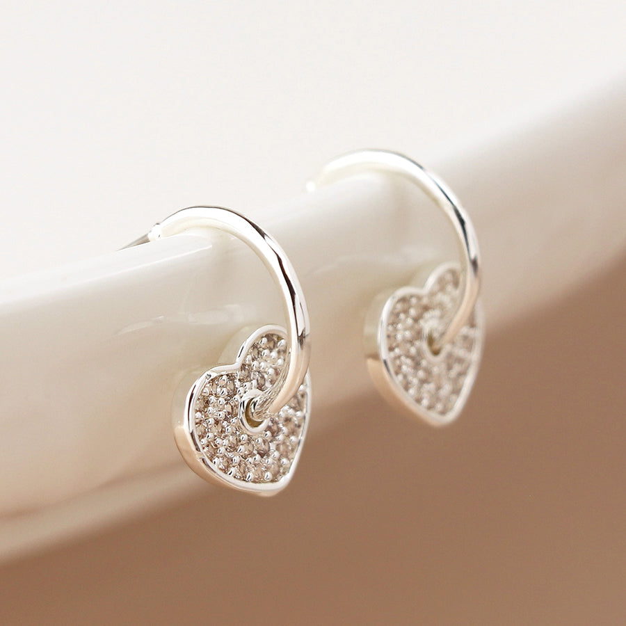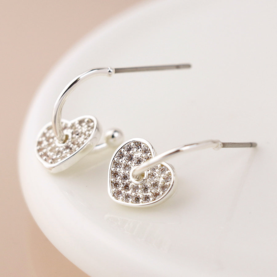 Silver plated c-post hoop earrings threaded through crystal encrusted heart charms.