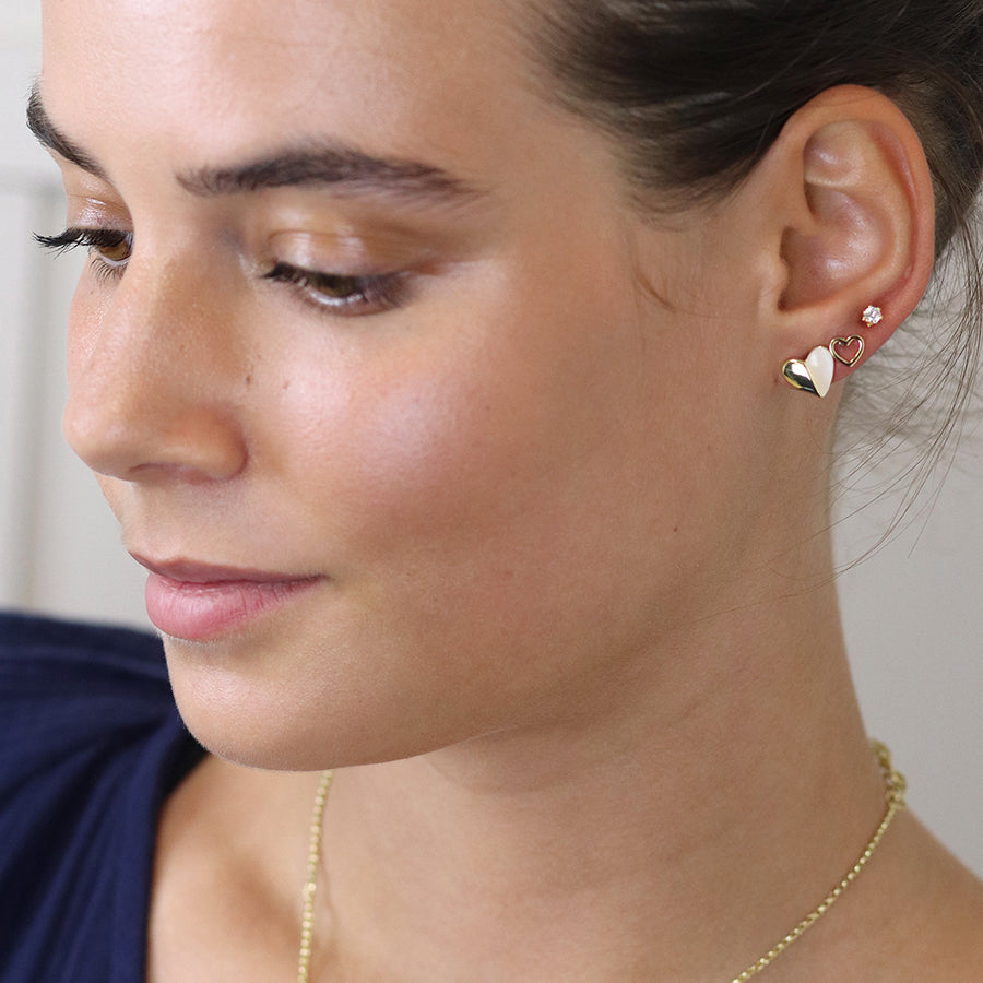 Faux gold plated triple stud earring set with split gold and shell heart earrings, tiny cut-out heart earrings and classic fine crystal studs.