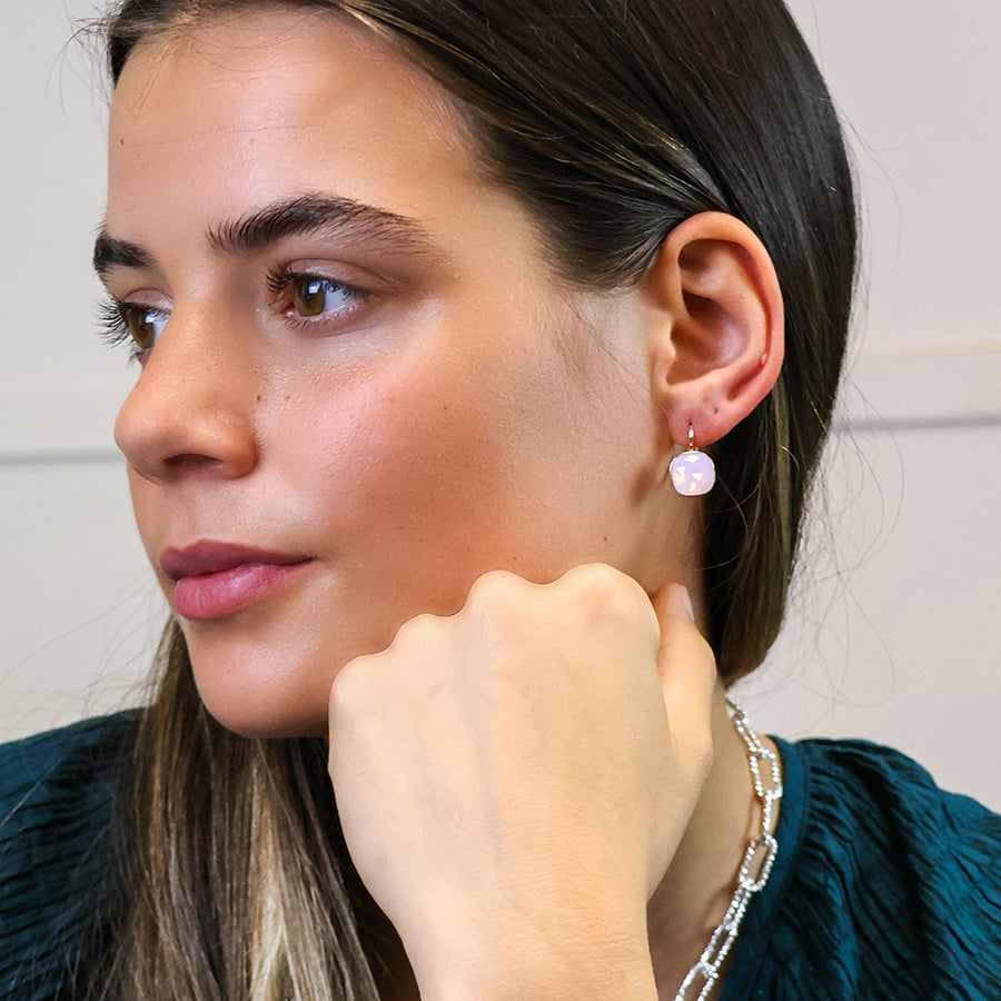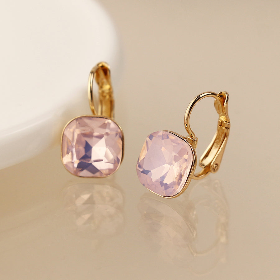 Faux gold plated hinge fastened earrings with square faceted pink crystal drops.
