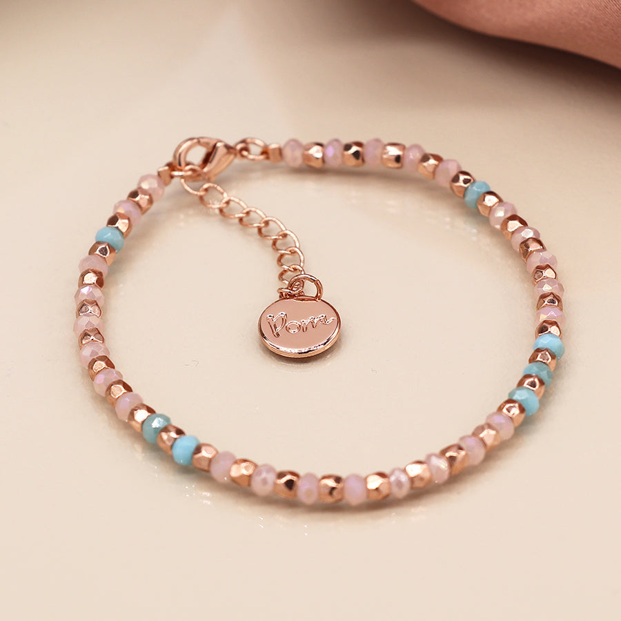 Faceted bead bracelet in aqua blue lilac and rose gold with a rose gold style lobster clasp and chain fastening.