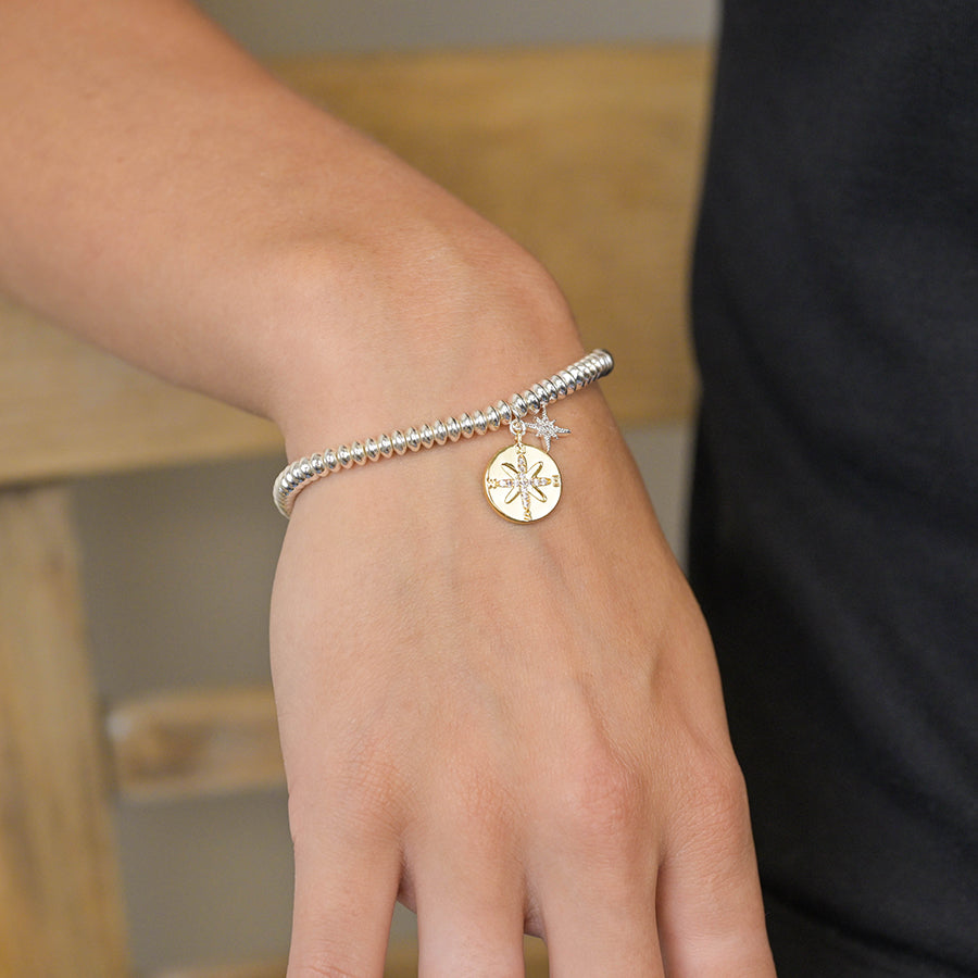 Silver plated ellipse bead bracelet with a faux gold plated nautical compass charm and a small silver plated star charm, both featuring crystal detailing.