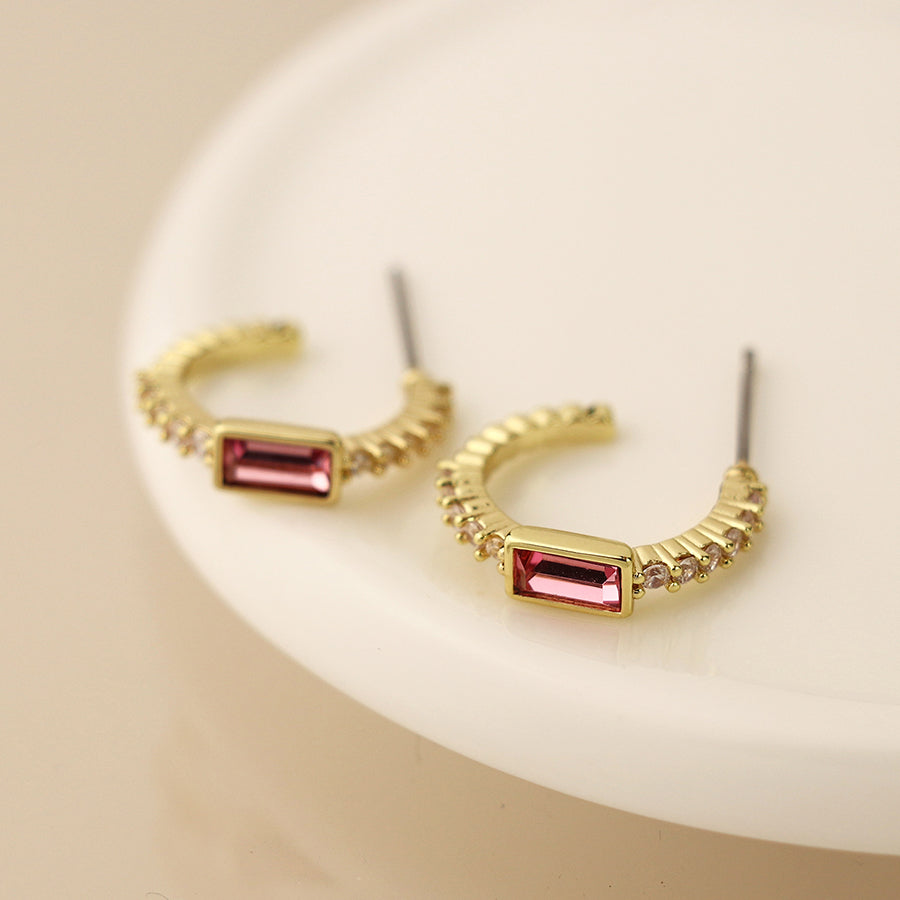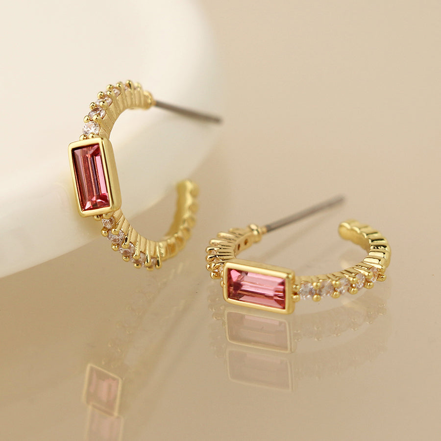 Golden hoop stud earrings with oblong pink crystals and tiny clear crystals.