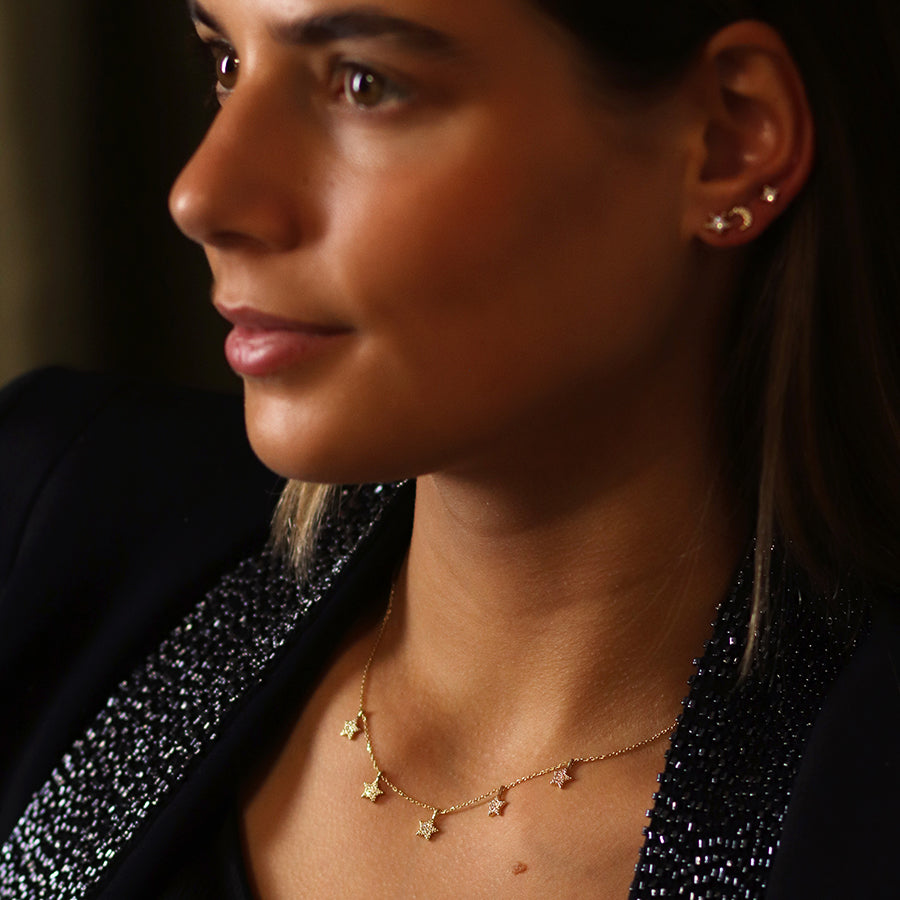 Faux gold plated fine chain necklace with five crystal set star drops.