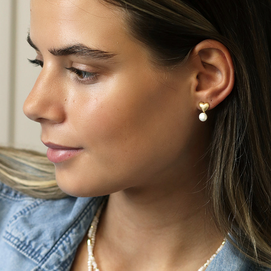Brushed Faux Gold Heart Earrings with Pearl