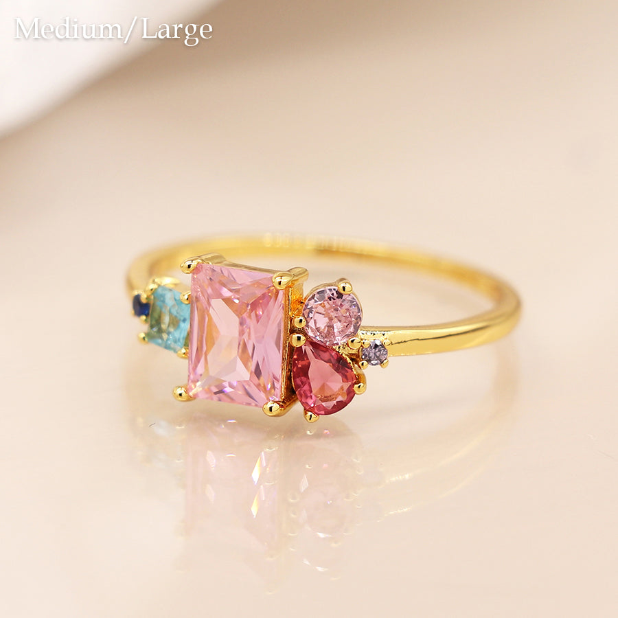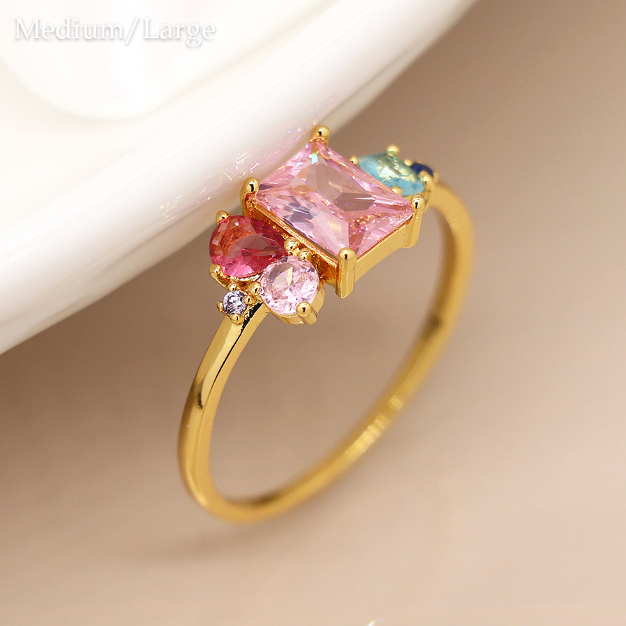 Gold plated ring with mixed shape pink and aqua mix gemstone cluster combining rectangular round and teardrop crystals.