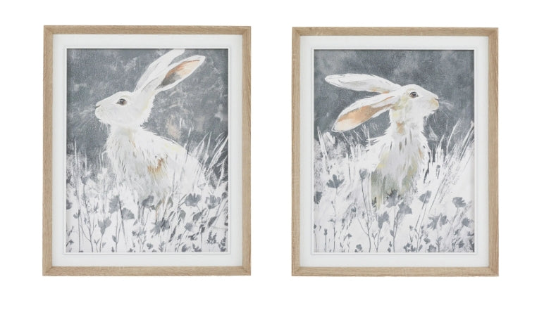 This set of 2 depicts hares resting among soft meadow blooms. Gentle brushwork and earthy tones capture their quiet poise and natural grace. Evoking the calm beauty of the countryside, this charming pair brings warmth and a touch of rustic elegance to any space