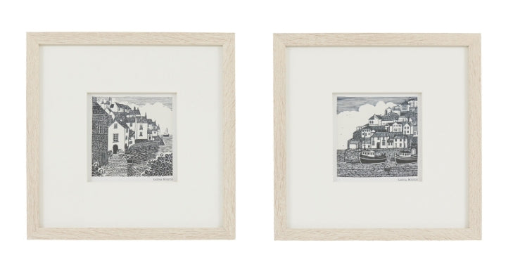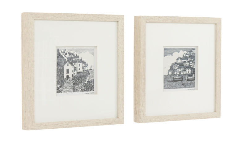 A delightful duo of small coastal village artworks featuring whitewashed cottages and peaceful harbours. The fine black and white detailing gives these pieces a handcrafted charm, evoking quiet seaside moments. Presented in a frame with a pale oak finish, these compact compositions bring warmth and character, perfect for adding a touch of coastal elegance to any interior space.