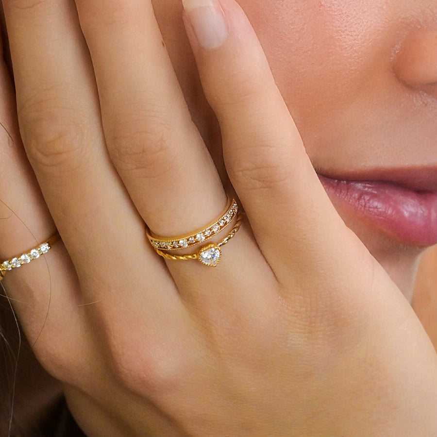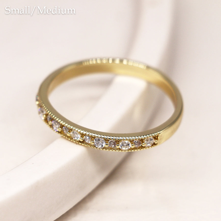 Gold plated ring with elegant mixed size crystal inset band and fine millgrain edging - Small/Medium
