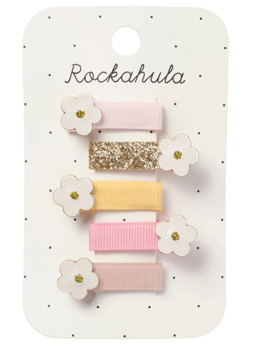 This pack of 5 mini bar clips in an array of different colours will delight all flower lovers! Each clip features a mini daisy to one side and each clips is covered in grosgrain fabric for maximum comfort.