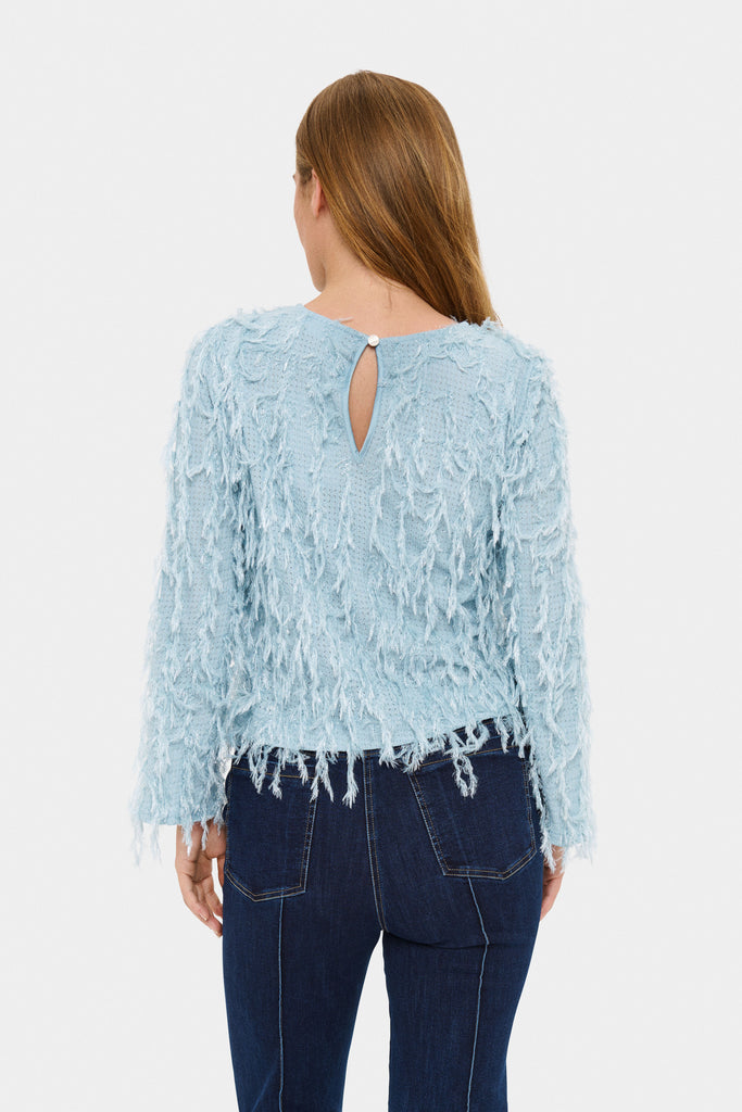Elevate your wardrobe with the Ninette Blouse, crafted in a delicate powder blue shade that exudes subtle elegance. Featuring distinctive feather-style fringe details, this blouse adds a refined, artistic touch to your ensemble, making it perfect for sophisticated occasions. The lightweight fabric ensures comfort while maintaining a graceful silhouette, allowing you to make a stylish statement with ease.