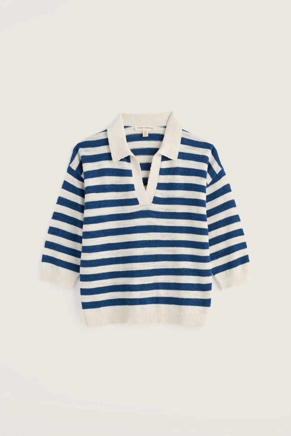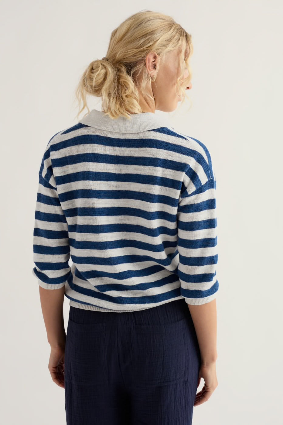 A light and airy jumper in a breathable organic cotton and linen blend. We’ve given the Gwynver a relaxed fit with a dropped shoulder and three-quarter length sleeves. A collar and deep V-neck give it a refined yet casual feel that’s perfect paired with shorts or linen trousers.