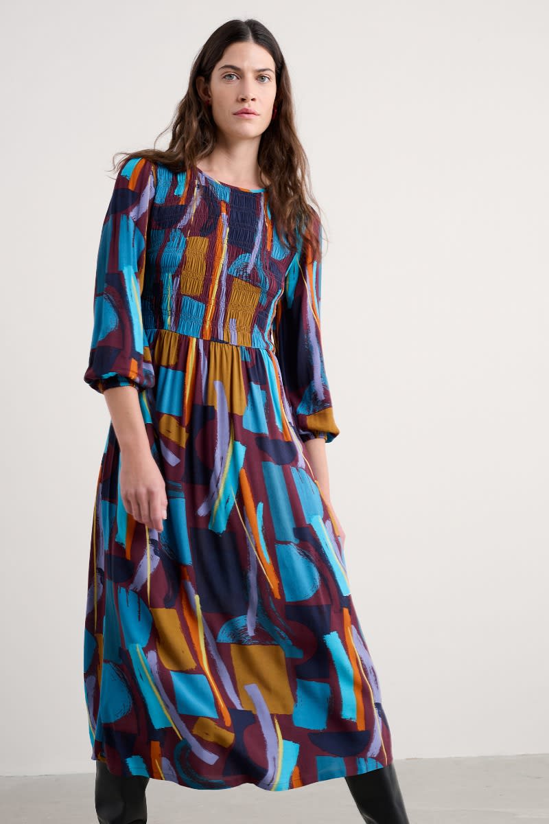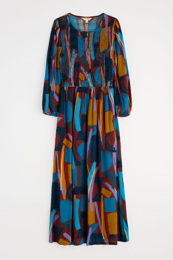 A new wardrobe favourite for everything from morning walks to evening dinners. The Meadowsweet Dress has a stretchy smocked bodice for a comfortable and flattering fit, and long blouson sleeves that add shape to the feminine silhouette. Made from a lightweight, drapey blend of organic cotton and viscose, the skirt falls just above the ankle and features subtly hidden pockets.