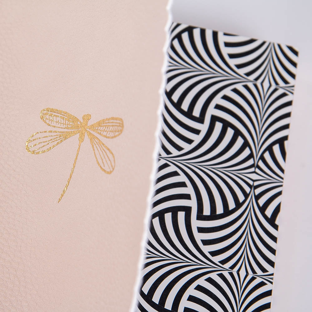 The delicate dragonfly is emblazoned in shimmering gold on the vegan cover with a leather look.