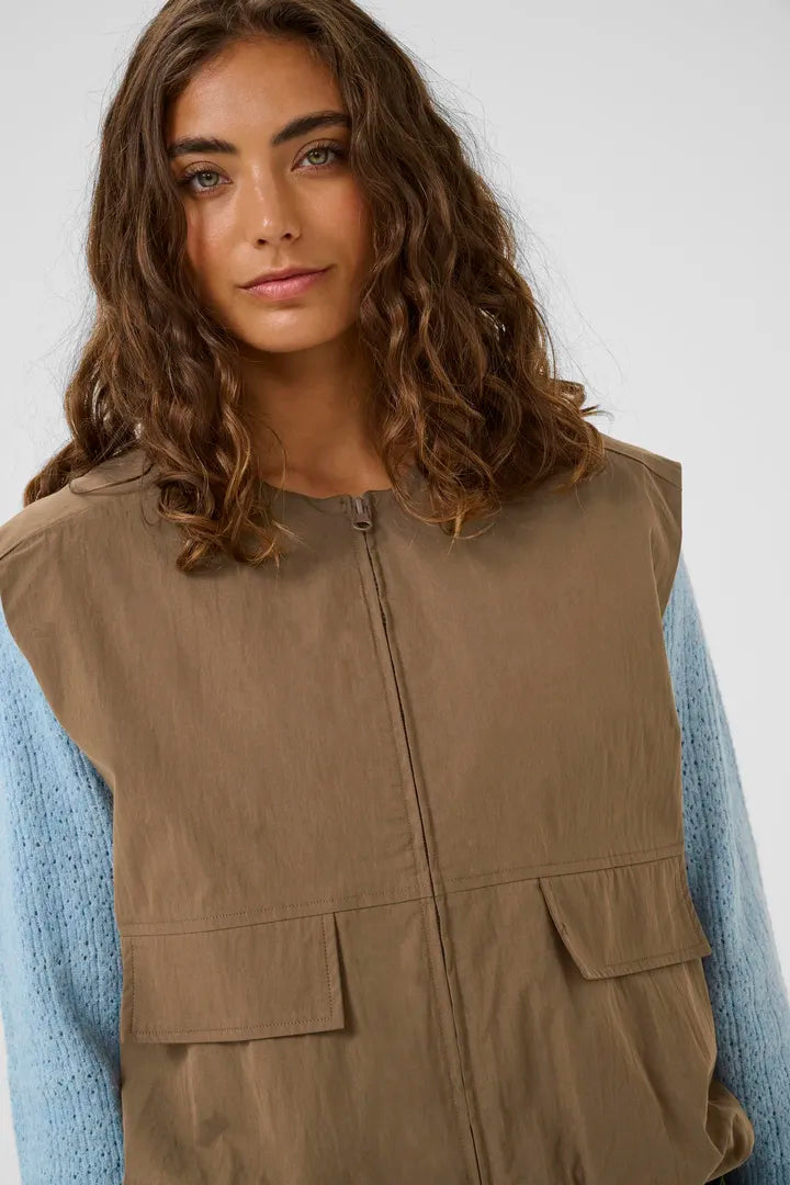 Dark taupe waistcoat with large decorative front pocket.