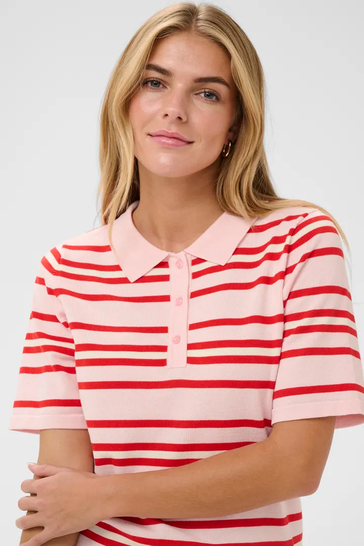 Short-sleeved polo shirt with a straight fit featuring a classic flat collar and a three-button placket. This top has a horizontal stripe design throughout and finishes at hip length. Textured appearance with ribbed cuffs and hem.