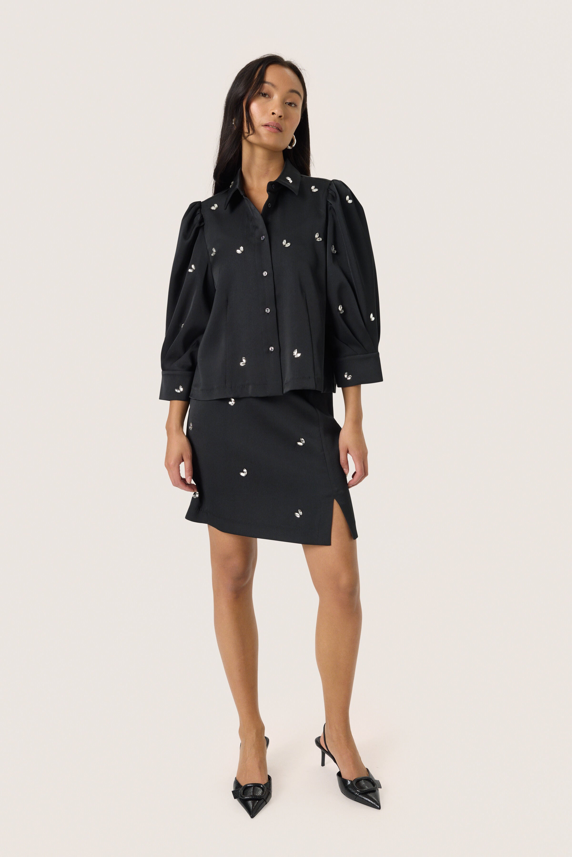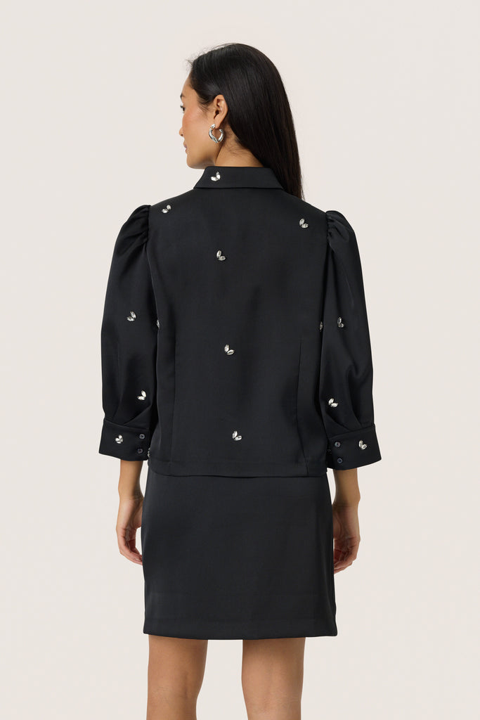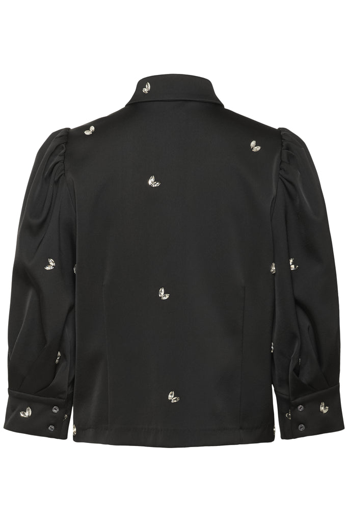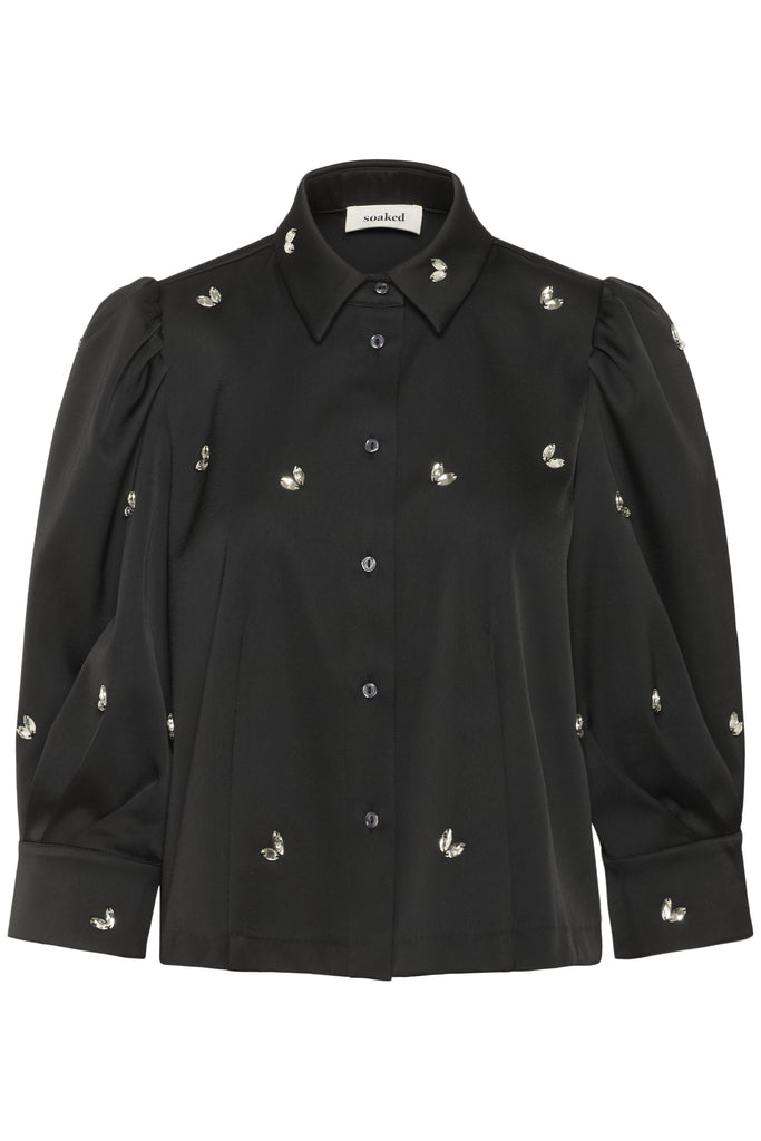 Elevate your wardrobe with the Selda Shirt, featuring exquisite diamante beaded accents that catch the light with every movement. Its elegant puff sleeves add a refined silhouette, combining classic sophistication with a modern edge. Perfect for both formal occasions and stylish everyday wear, this black blouse offers a timeless statement piece that enhances any outfit.