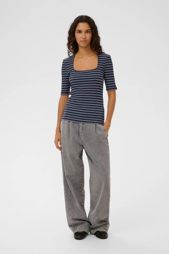 Ribbed striped top with a square neckline and fitted silhouette. Elbow-length sleeves and soft texture offer a modern, streamlined look for any casual style