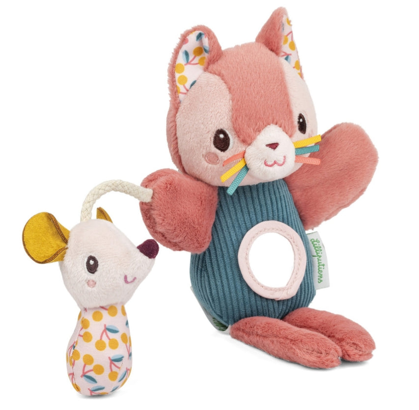 Jeanne the kitten comes to life when you animate her with your fingers! She makes a soft rattle sound hidden inside that gently wakes baby. Her soft friend adds a sensory surprise with a crinkle sound. Thanks to its compact size, it's easy to store away to entertain baby anytime