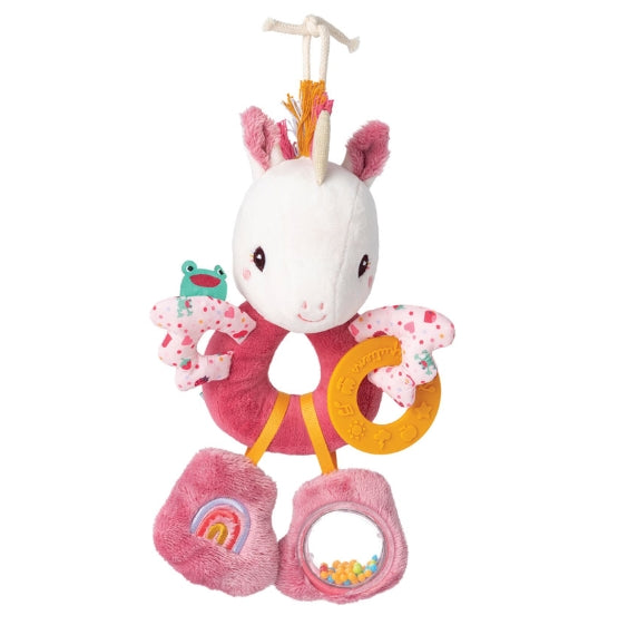 This rattle, easy for little hands to grasp, stimulates baby's senses with its colors, different sounds, and textures. Lena the unicorn helps develop baby's motor and cognitive skills while also entertaining them