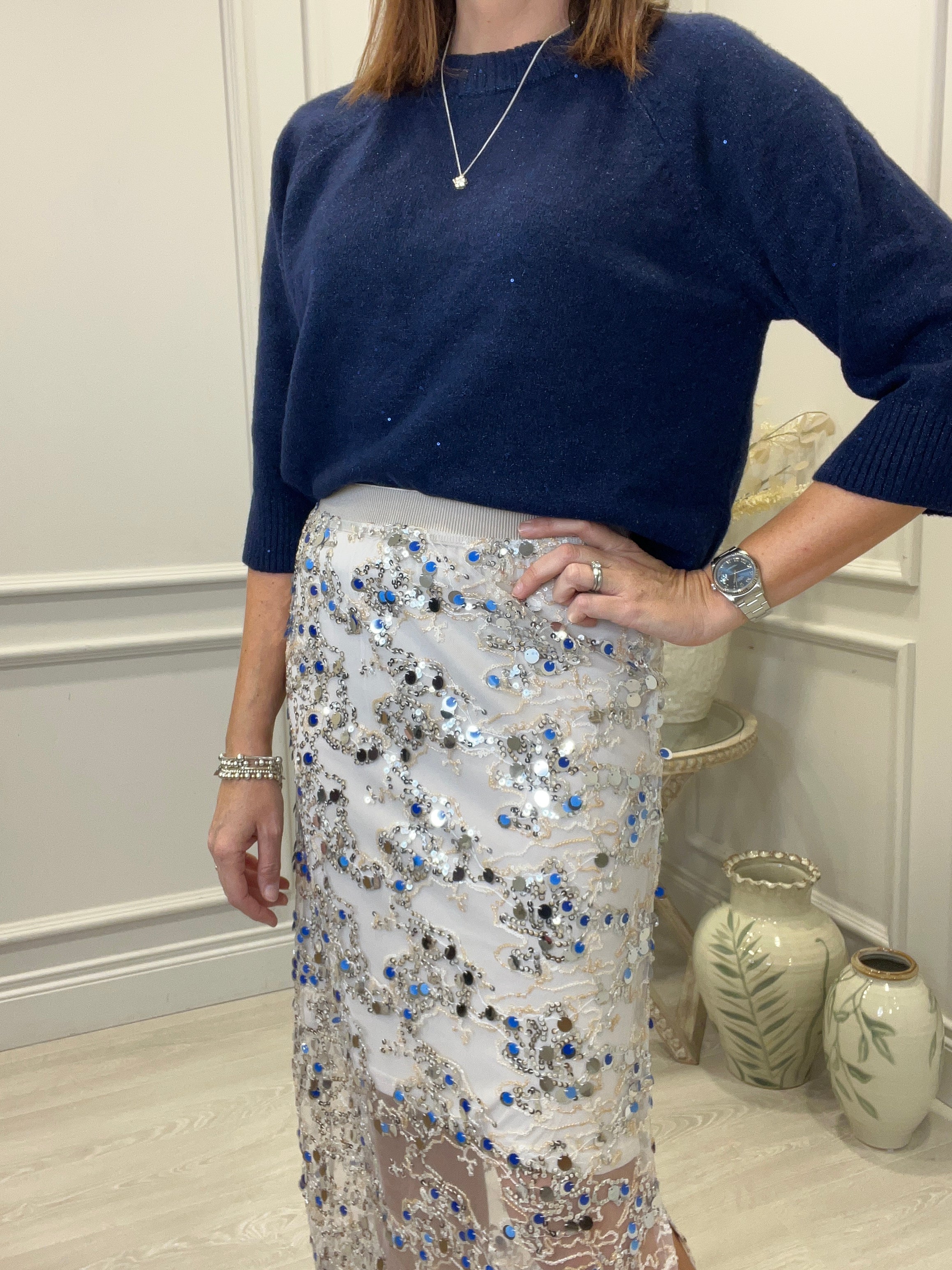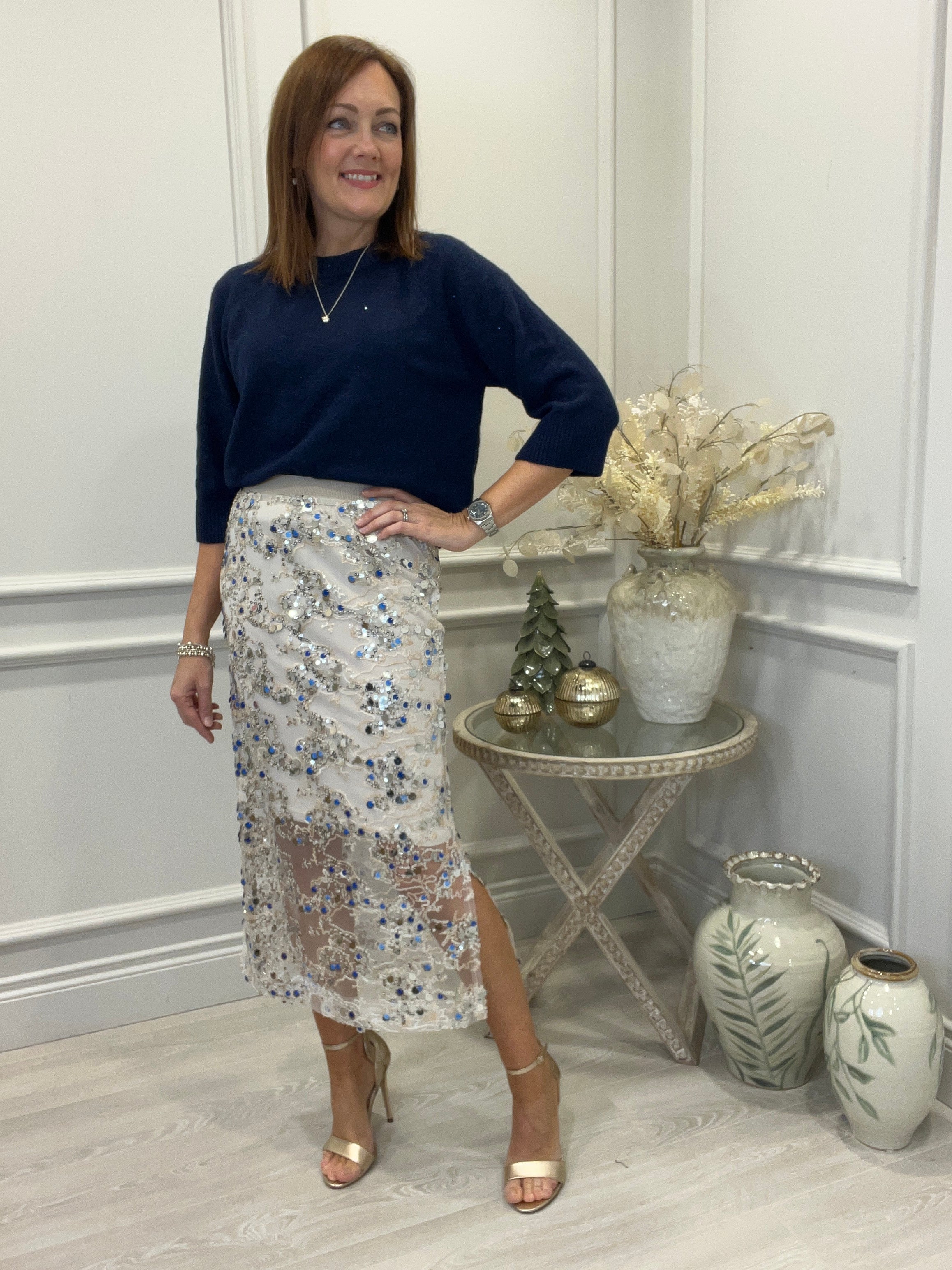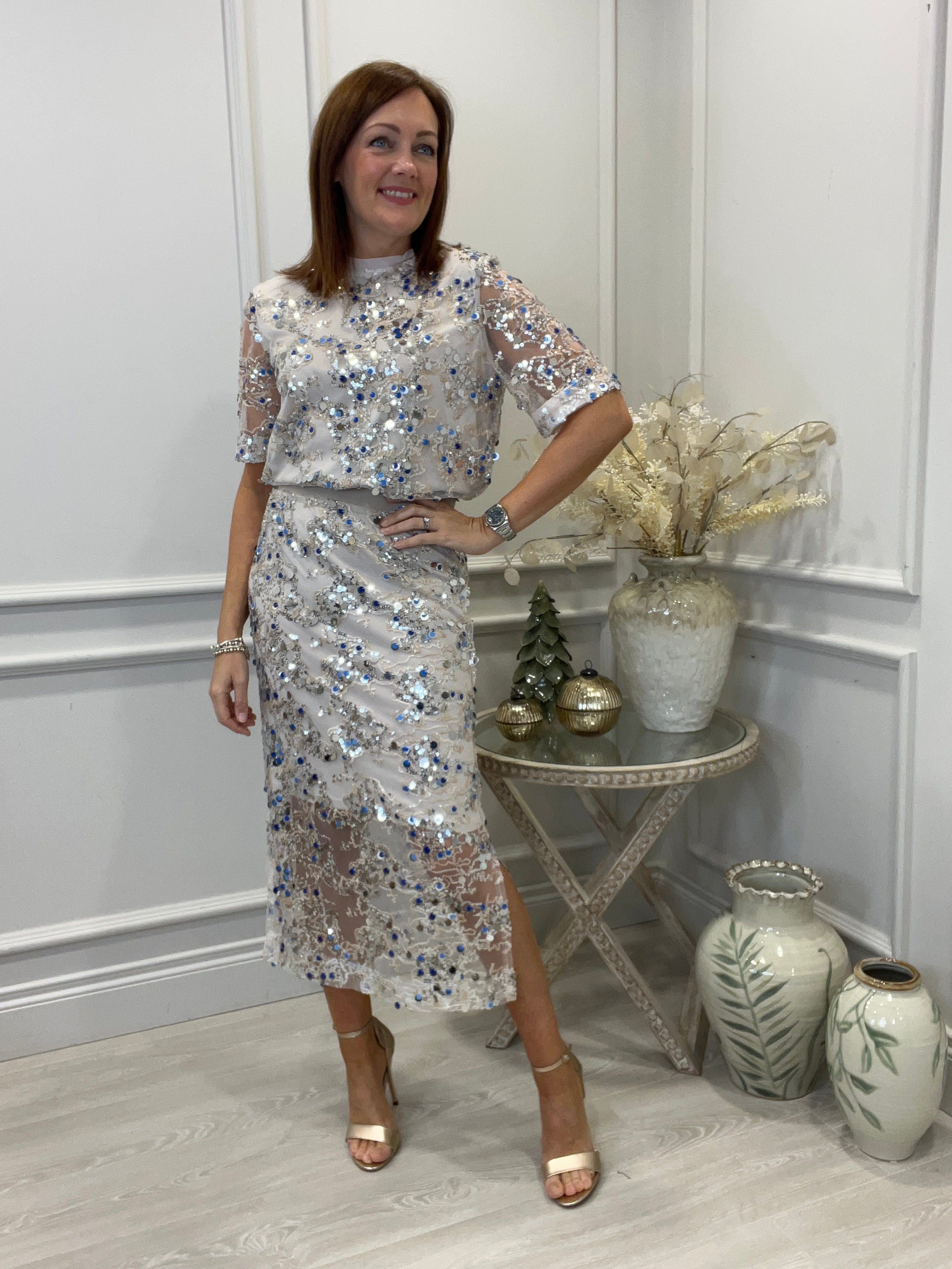 Elevate your wardrobe with the Nelda Skirt, featuring a delicate off white base layered with a sheer overlay for subtle dimension. Adorned with intricate multi-colour sequin beading, this piece captures light beautifully, adding refined sparkle to any occasion. Its elegant design blends timeless sophistication with contemporary charm, perfect for making a graceful statement.